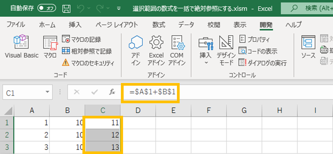マクロが実行され、C1セルの数式が絶対参照に変換されます。